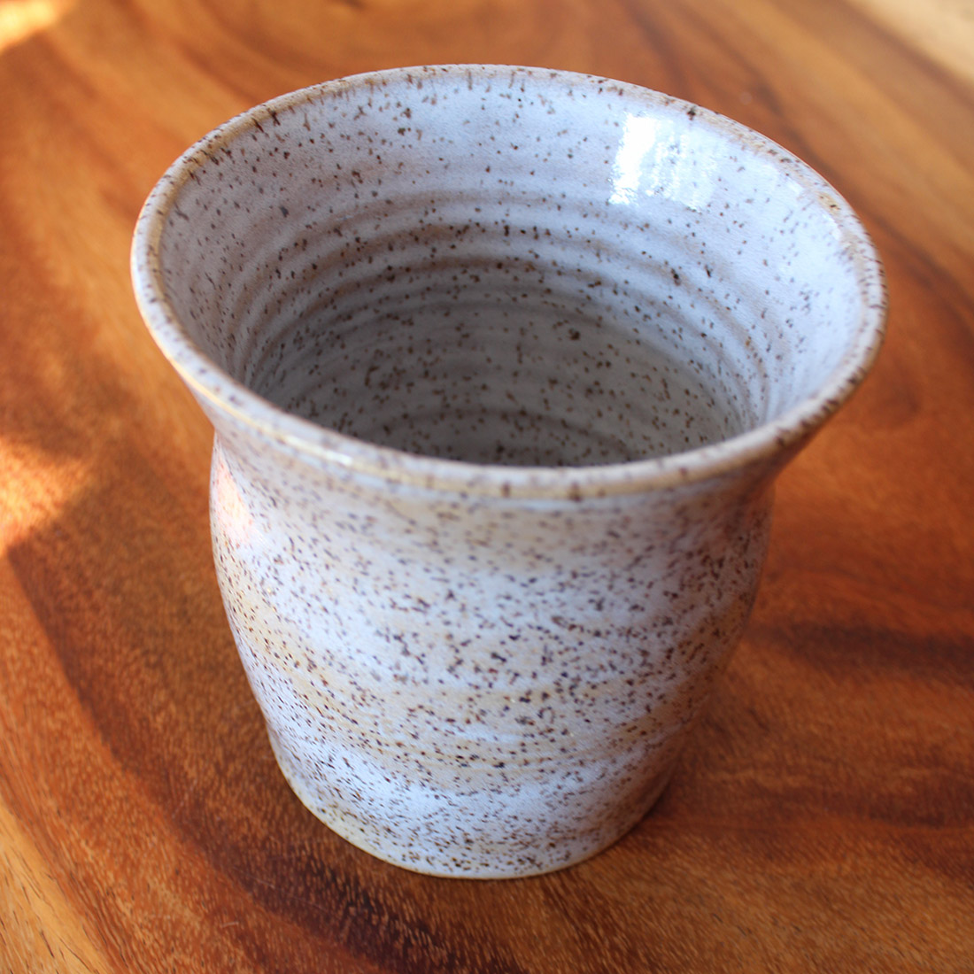 A medium-sized vase with a simple, open form and a soft, speckled glaze in warm earth tones. Quiet and rustic, it’s made to hold a full bouquet or a simple dried arrangement.