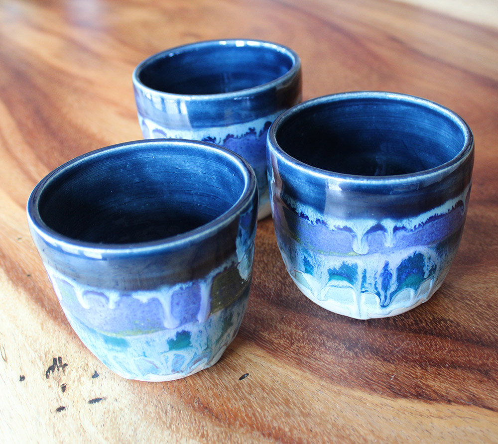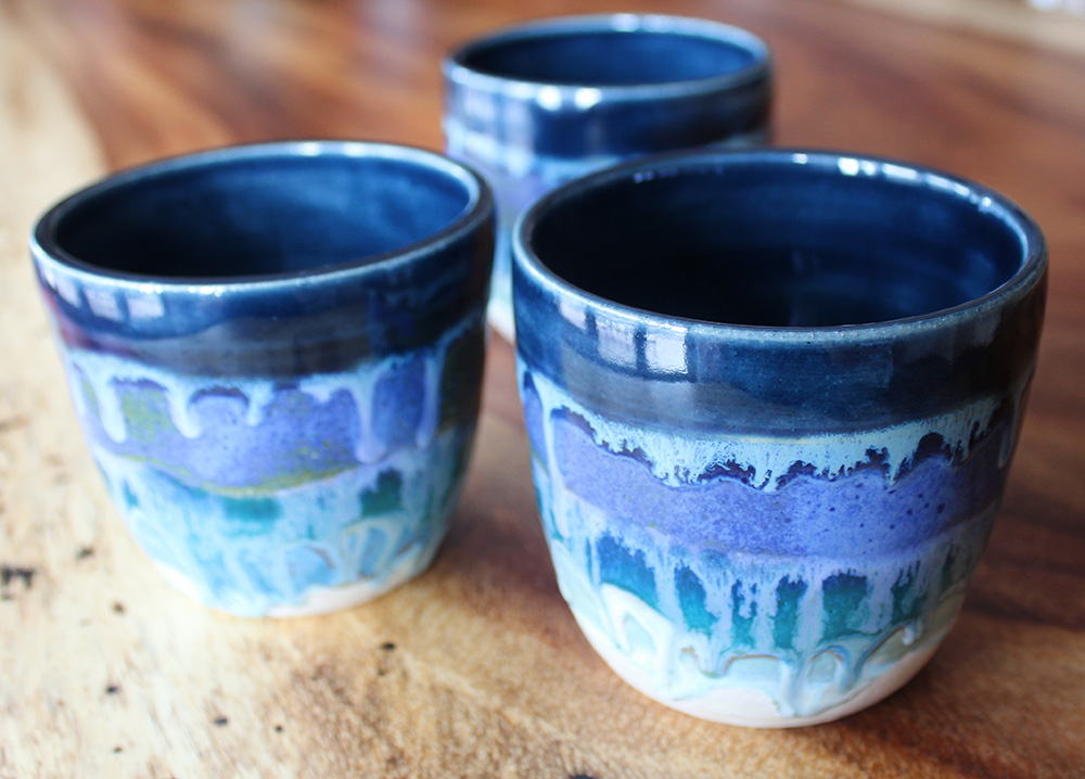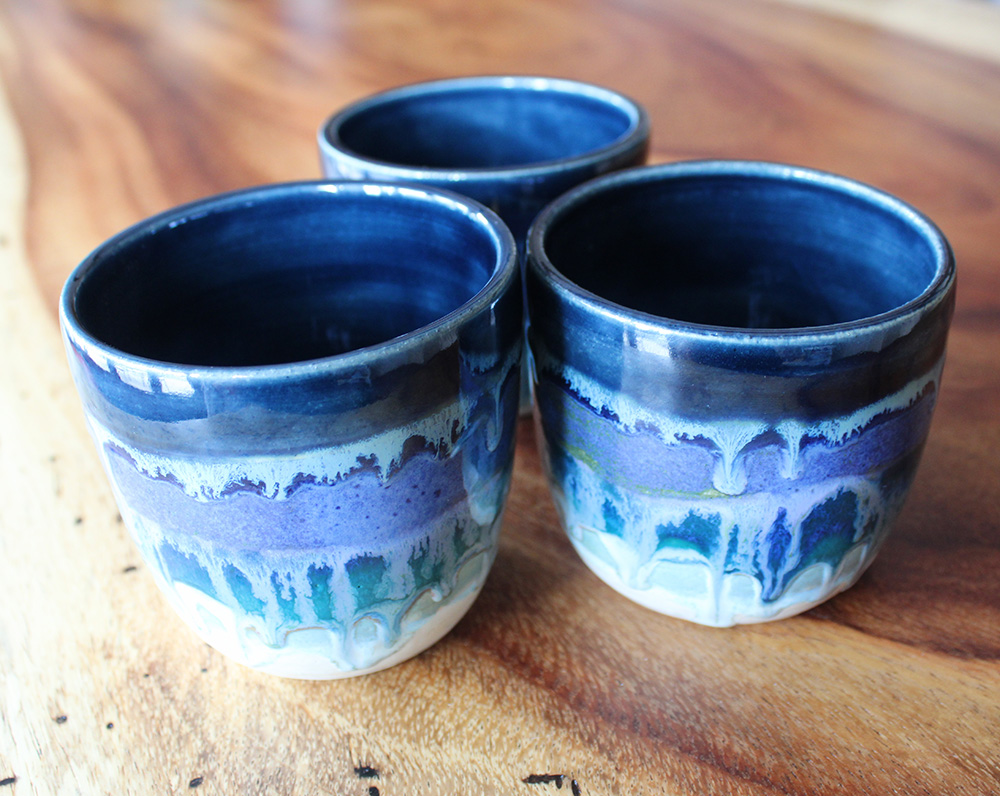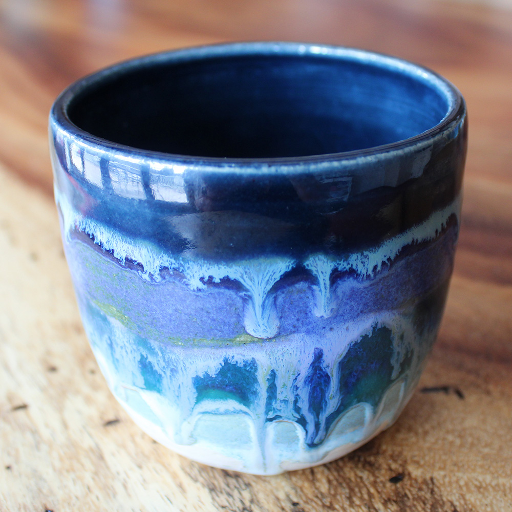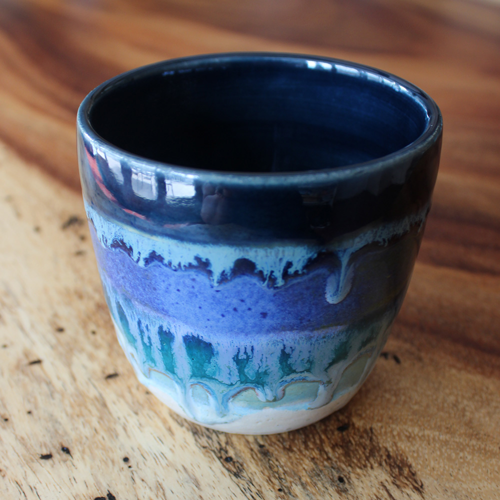 This tumbler carries a shoreline palette, with dark blue at the top and layered glaze breaking downward in wave-like bands. White glaze moves through the surface like foam over water and sand. A good everyday tumbler for iced coffee, tea, or anything cool you enjoy on a warm spring or summer day.