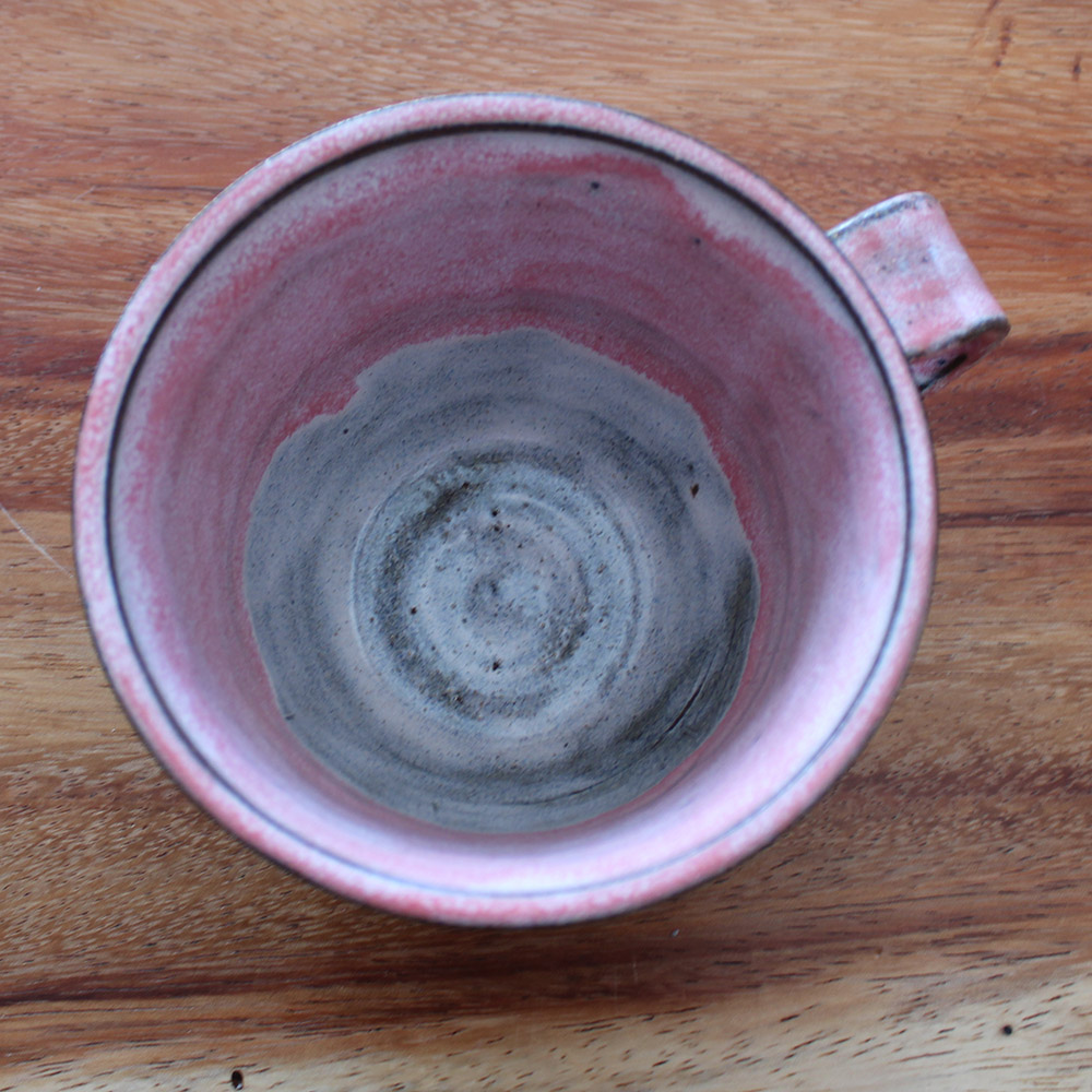 A 10 oz mug with a soft taper and a comfortable handle, made of warm red clay with a gentle rose glaze. The surface feels light and fresh, suited to spring mornings.