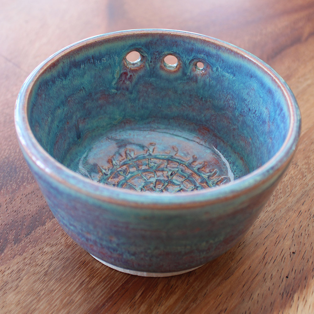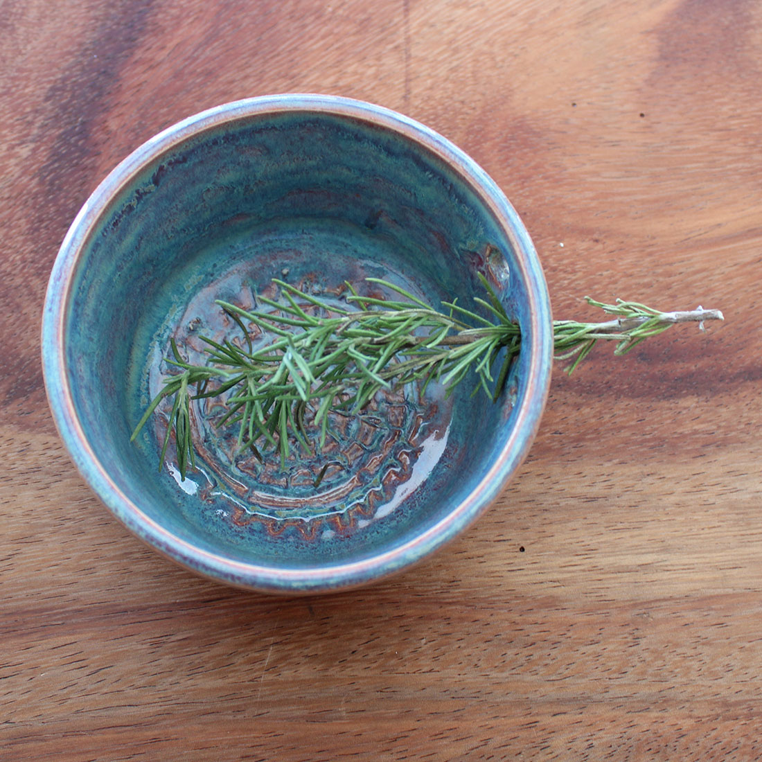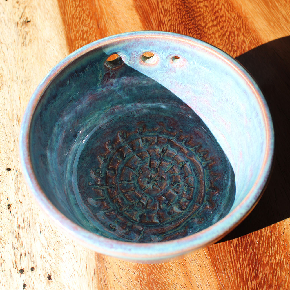 A small hand-thrown herb bowl with a soft, rounded form and 3 openings near the rim. Designed to strip herbs like rosemary or thyme, the sprig is pulled through the hole, cleanly separating leaves from stem. Finished in layered blue and pink tones that break gently across the surface, this bowl is made for everyday cooking and easy reach on the counter.