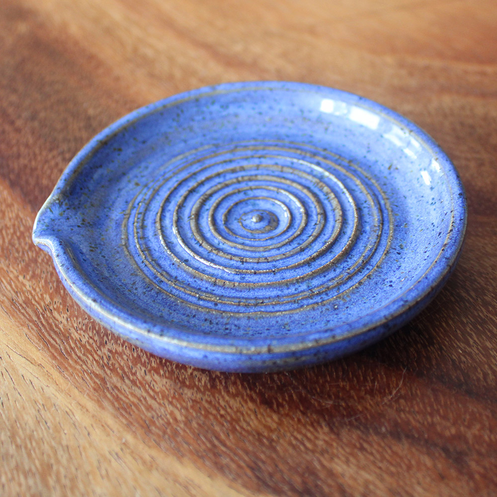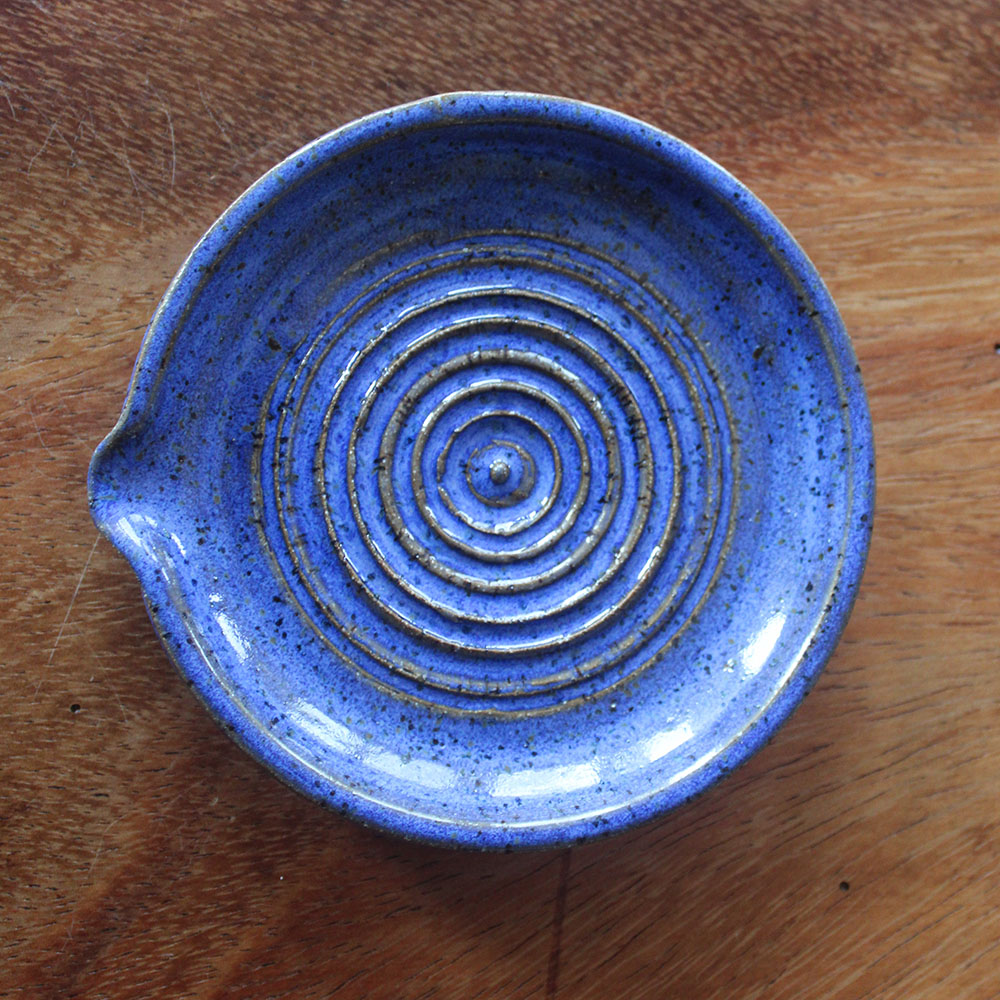 A small garlic grater plate with carved concentric ridges that make quick work of garlic or ginger. Finished in a deep blue glaze that settles into the rings and breaks gently over the texture, allowing the speckled clay to show through. A simple kitchen tool that’s as satisfying to use as it is to leave on the counter.