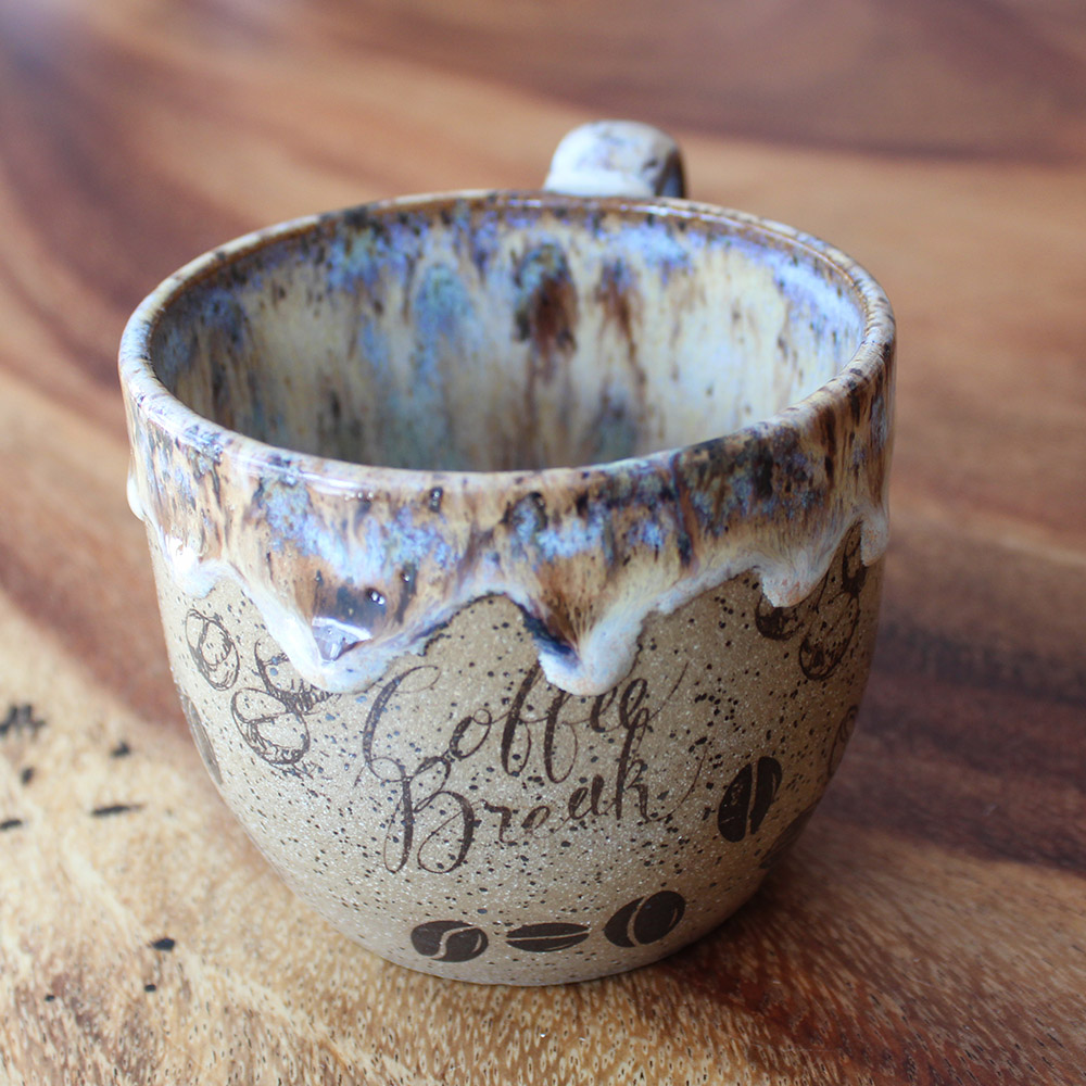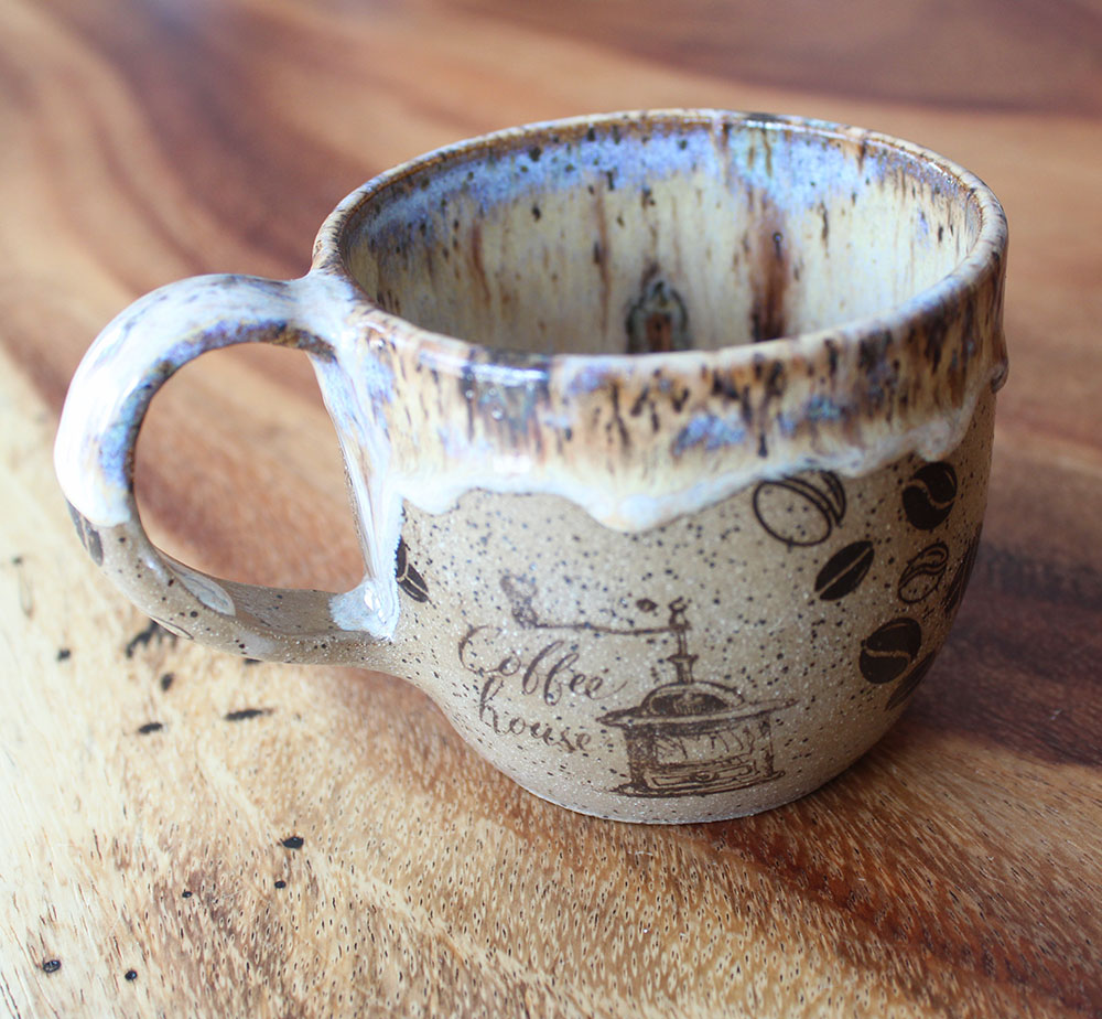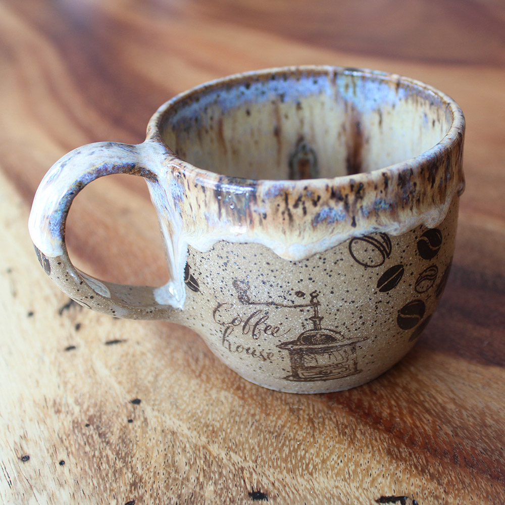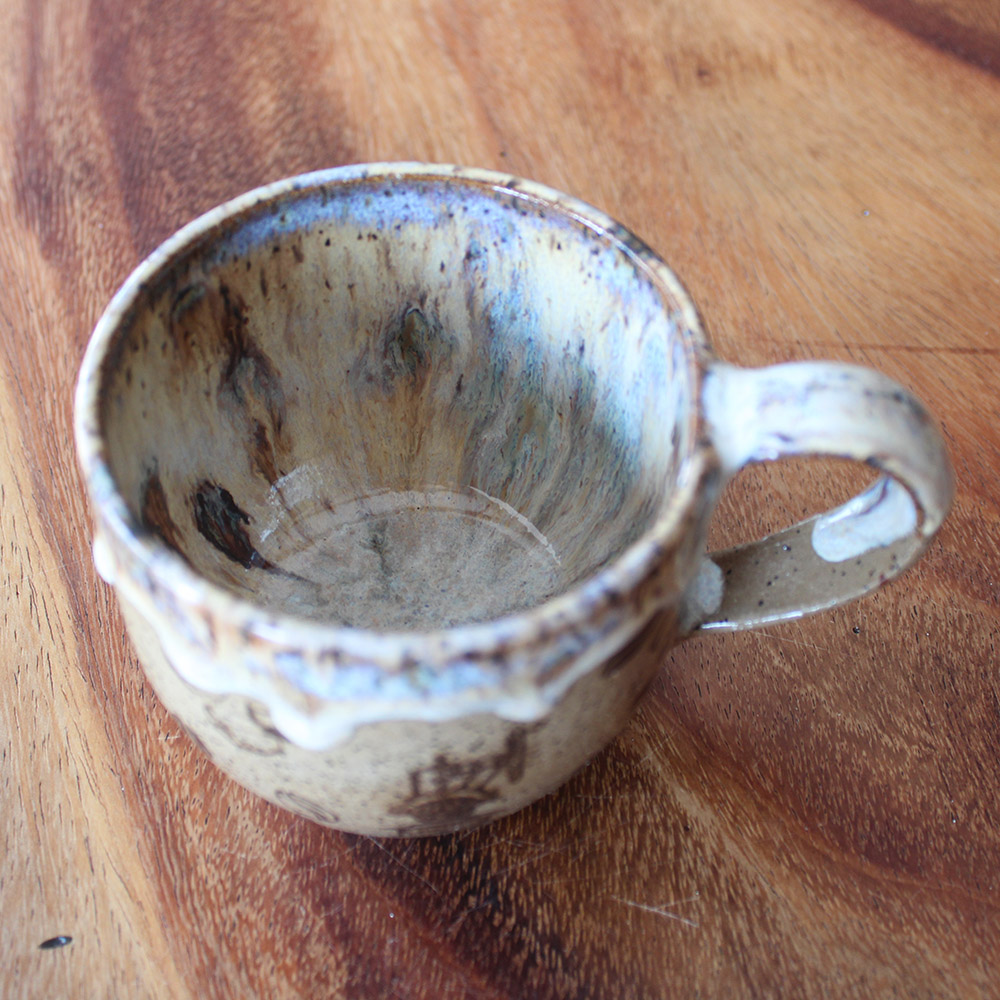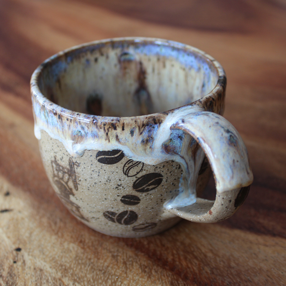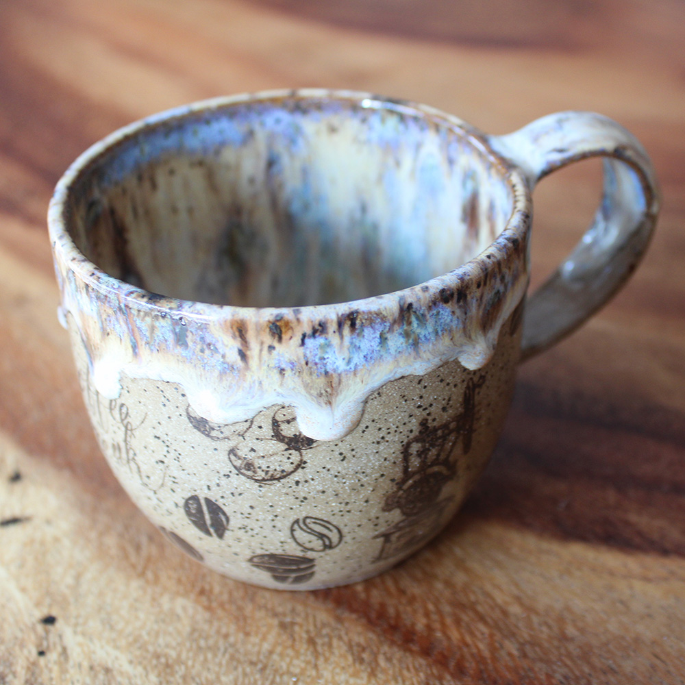 This mug pairs speckled clay, coffee-themed transfers, and layered glaze chosen to echo the look of coffee with milk or cream. The surface has rich movement at the rim and softer pooling below. Warm and welcoming in the hand it’s perfect for your first cup of the day or a slower afternoon refill.