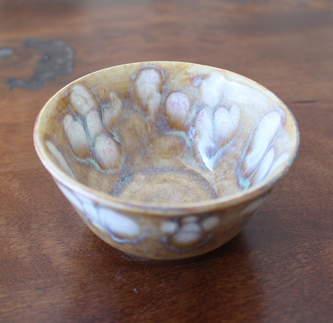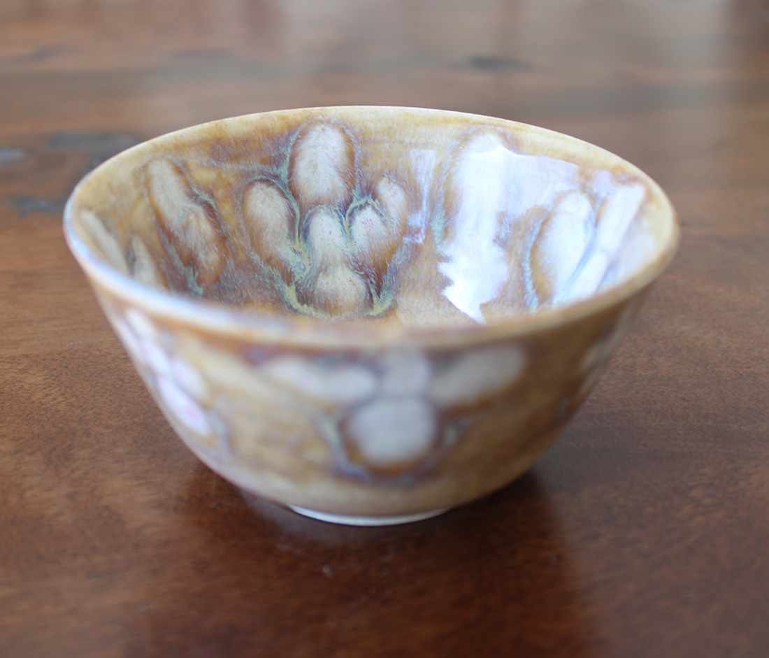 Warm ochre and sand tones form the base of this hand-thrown bowl, with soft, petal-like blooms in creamy whites edged in muted blue. The glaze breaks and pools naturally, creating quiet movement across the surface. Sized for small servings such as nuts, olives, berries, or a scoop of something sweet. A small bowl with presence, inspired by desert light and the quiet resilience of the landscape. Grounded, earthy, and easy to live with.