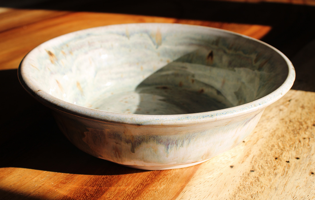 A wide, gently sloped bowl with a soft, misty glaze that settles into earthy blues and driftwood tones. The surface has a calm, natural variation, quiet, subtle, and easy to live with.Sized for generous meals, it works well for pasta, salads, stir-fries, or any comforting dinner you want to settle into.