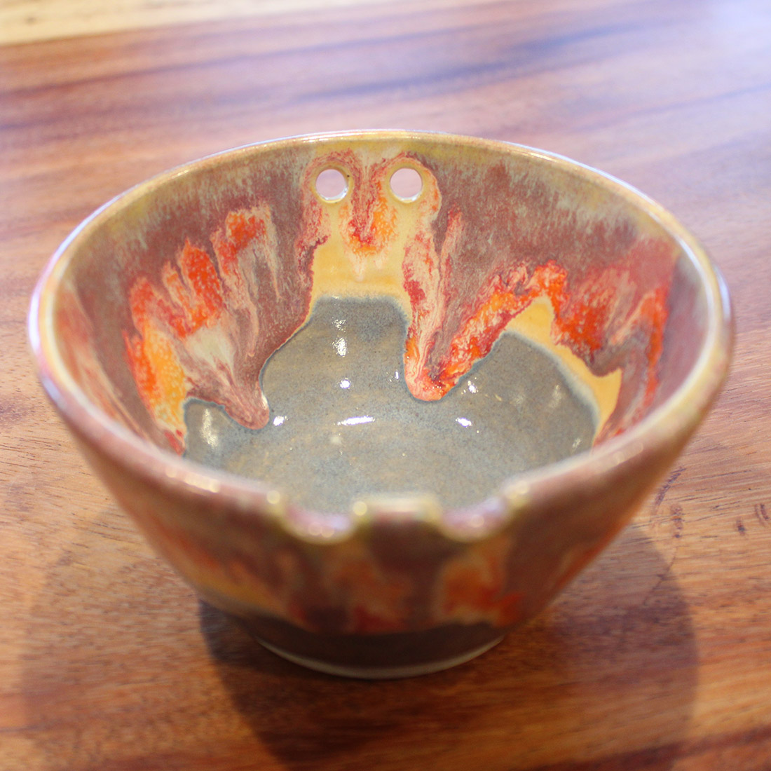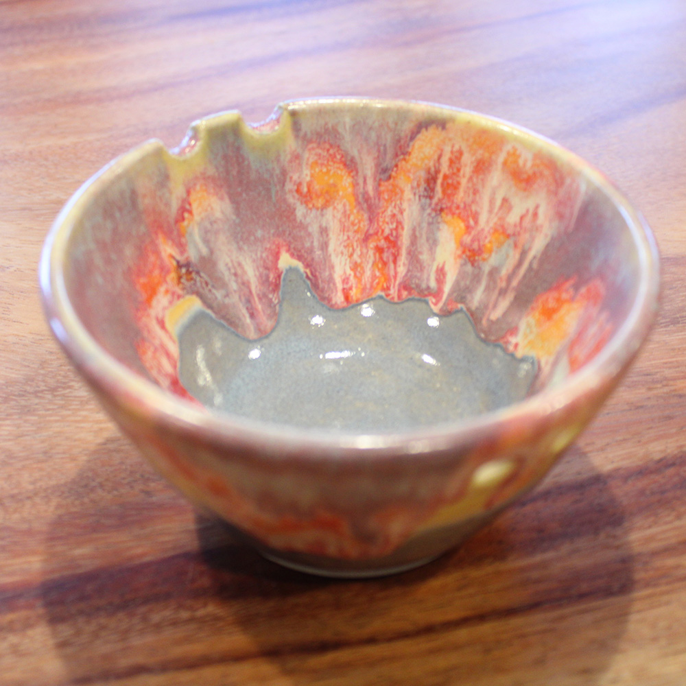 A wide chopstick bowl with notched rests, finished in layered reds, rust, and soft gold that pull downward into a cool gray base. Sized for rice or small bowls of noodles or ramen, with glaze that breaks and pools like late light at the horizon.