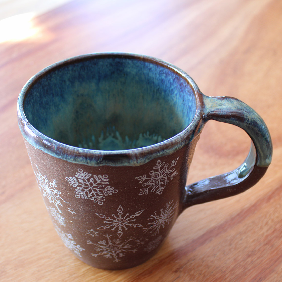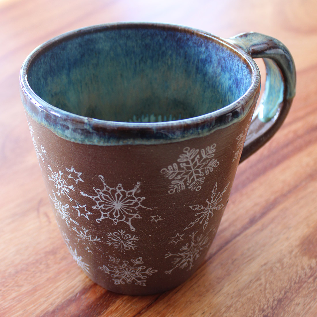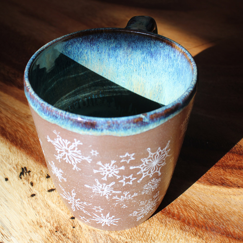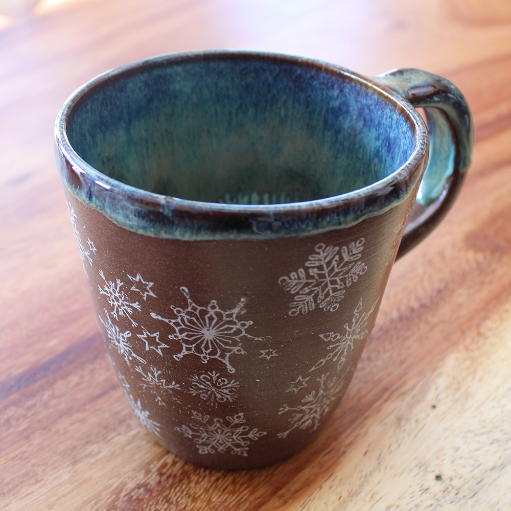 A large mug with a gentle taper and a smooth, rounded handle, made with warm red clay and glazed with a cool blue interior glaze. Pale snowflake patterns move across the surface, giving the cup a calm, seasonal feel, well suited to evenings by the fire with a warm drink in hand.