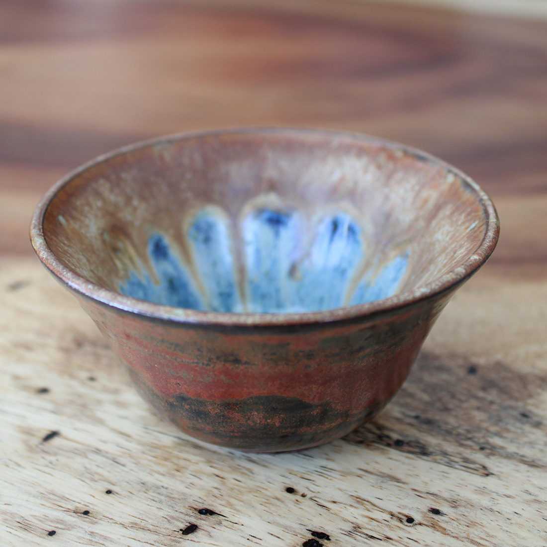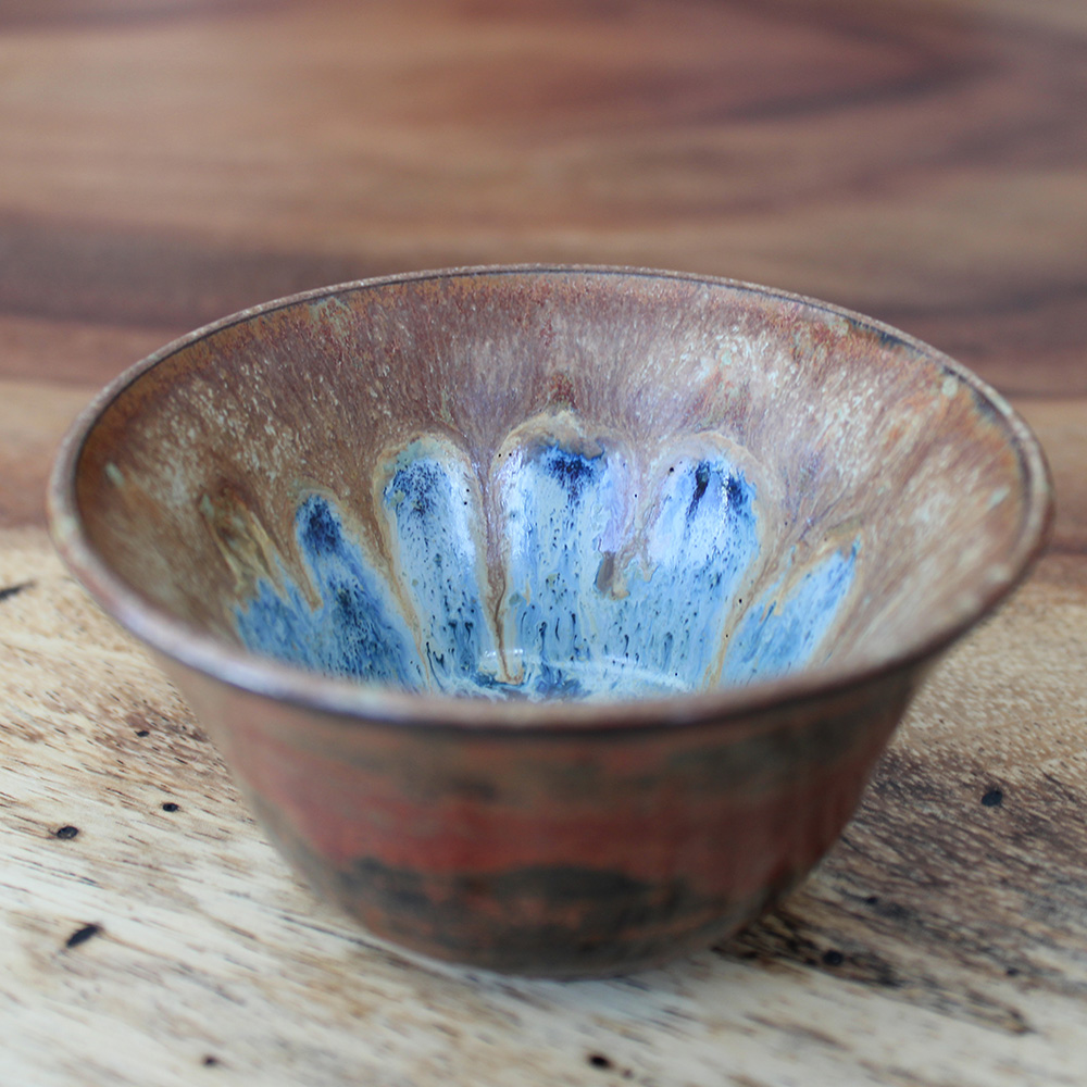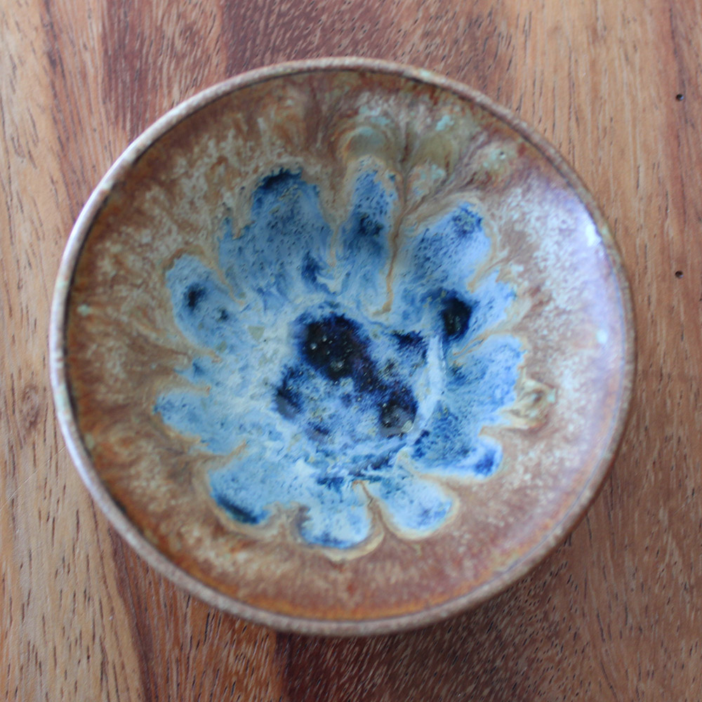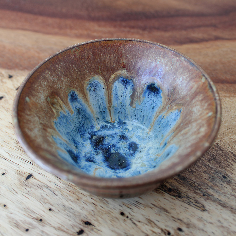 A small hand-thrown snack bowl with a warm, earthy exterior and a vibrant pool of blue breaking across the interior like water gathered in stone. The glaze blooms toward the center in layered blues and soft neutrals, giving it the quiet depth of a hidden cove. Perfectly sized for nuts, candy, olives, sauces, or small dips.