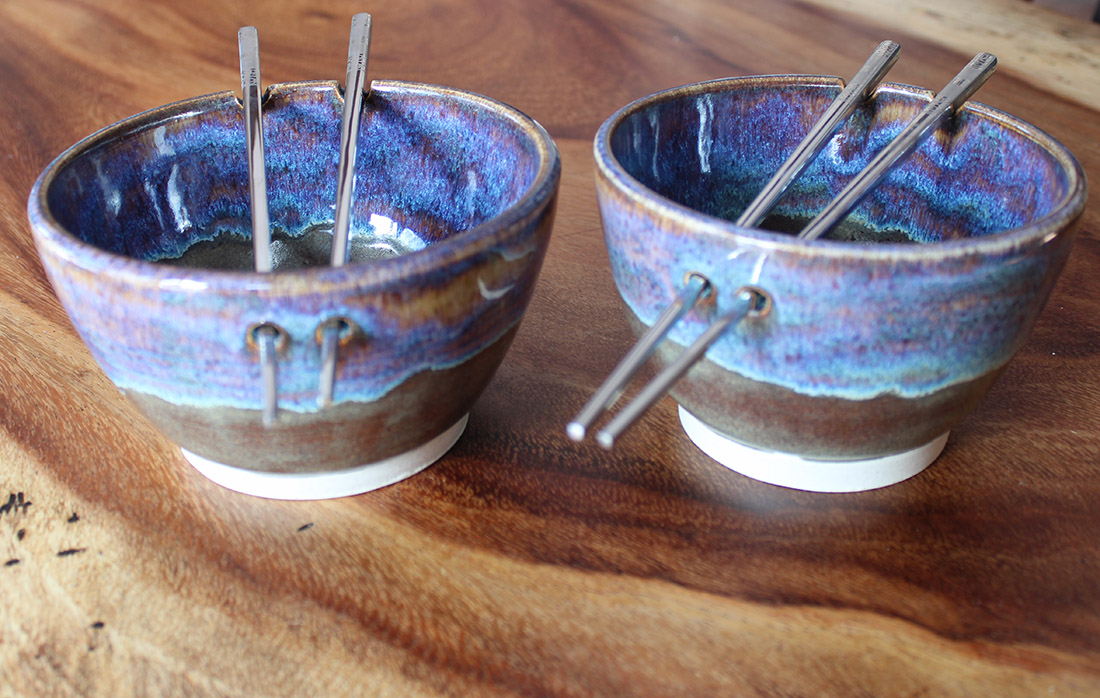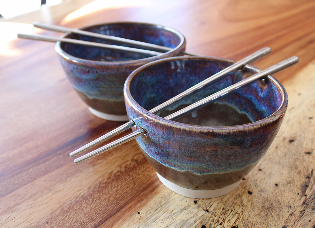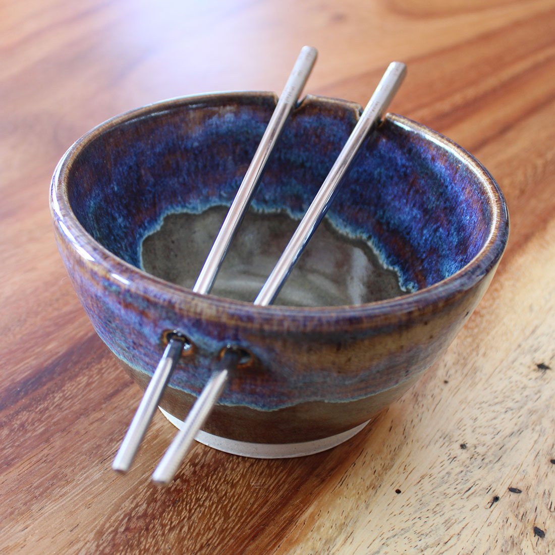 A noodle-sized bowl with a gently rounded form and integrated chopstick rests along the rim. The layered blue, green, and warm brown glazes create depth while remaining smooth and easy to clean. Well suited for ramen, noodle dishes, and other broth-based meals, this bowl is designed for everyday use and comfortable handling.
