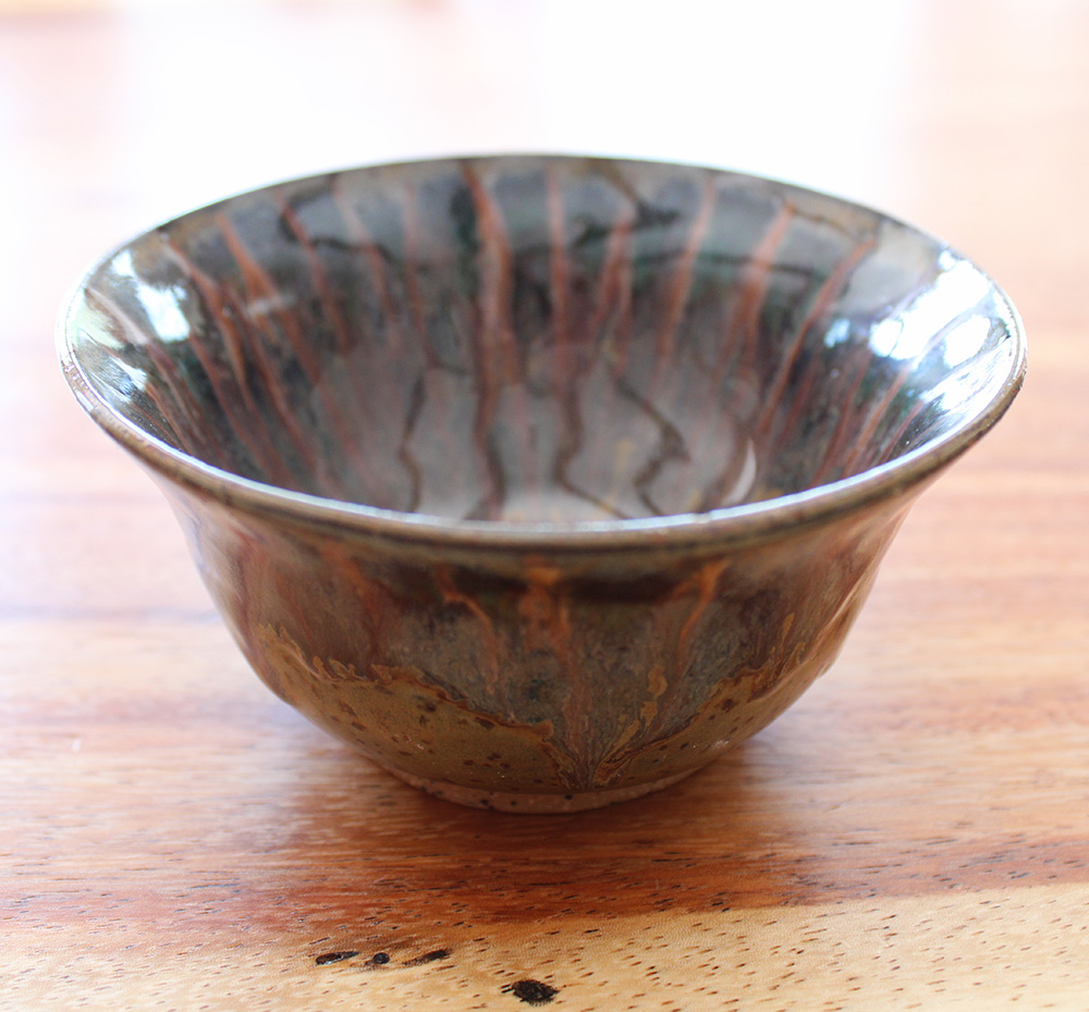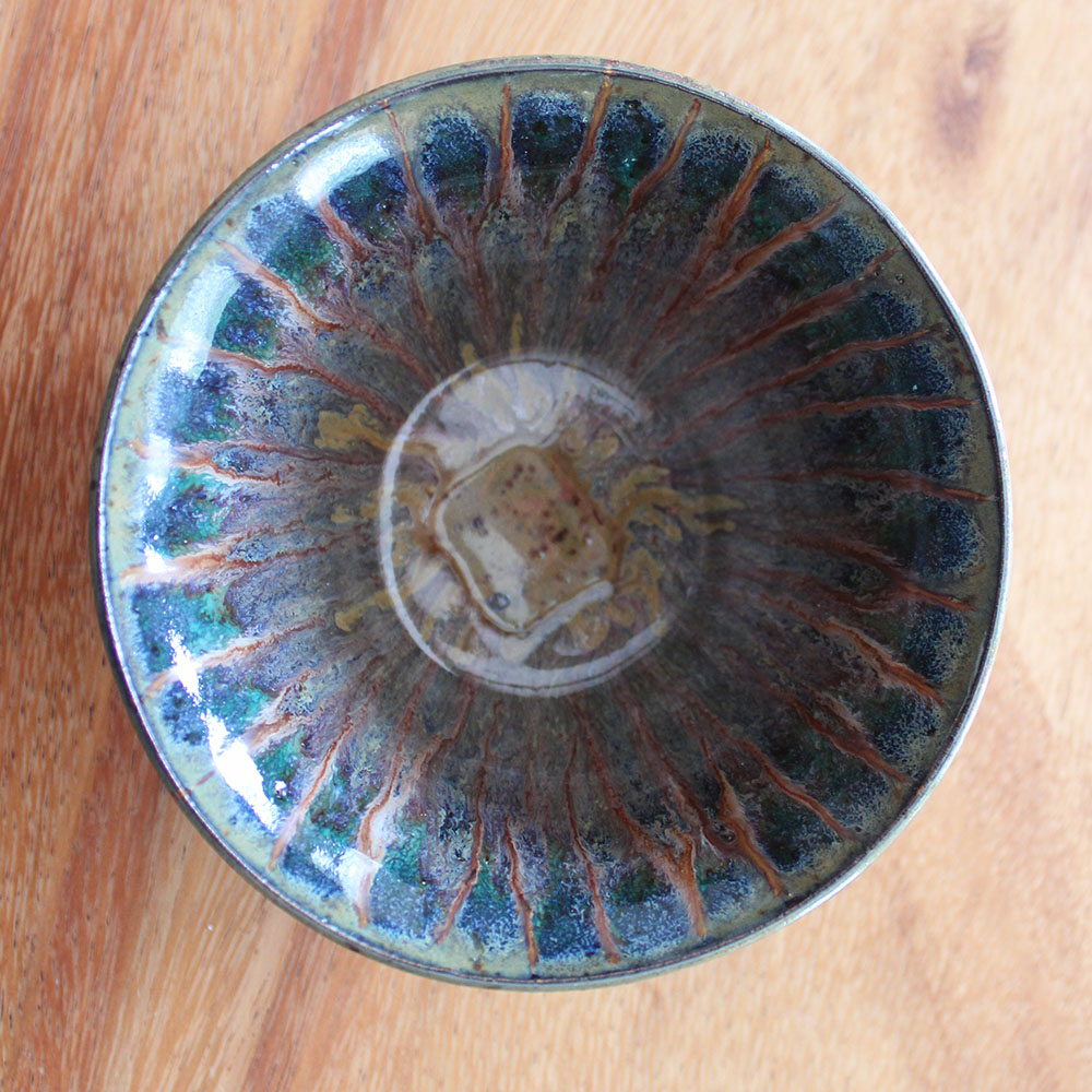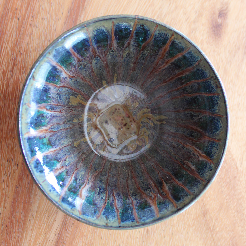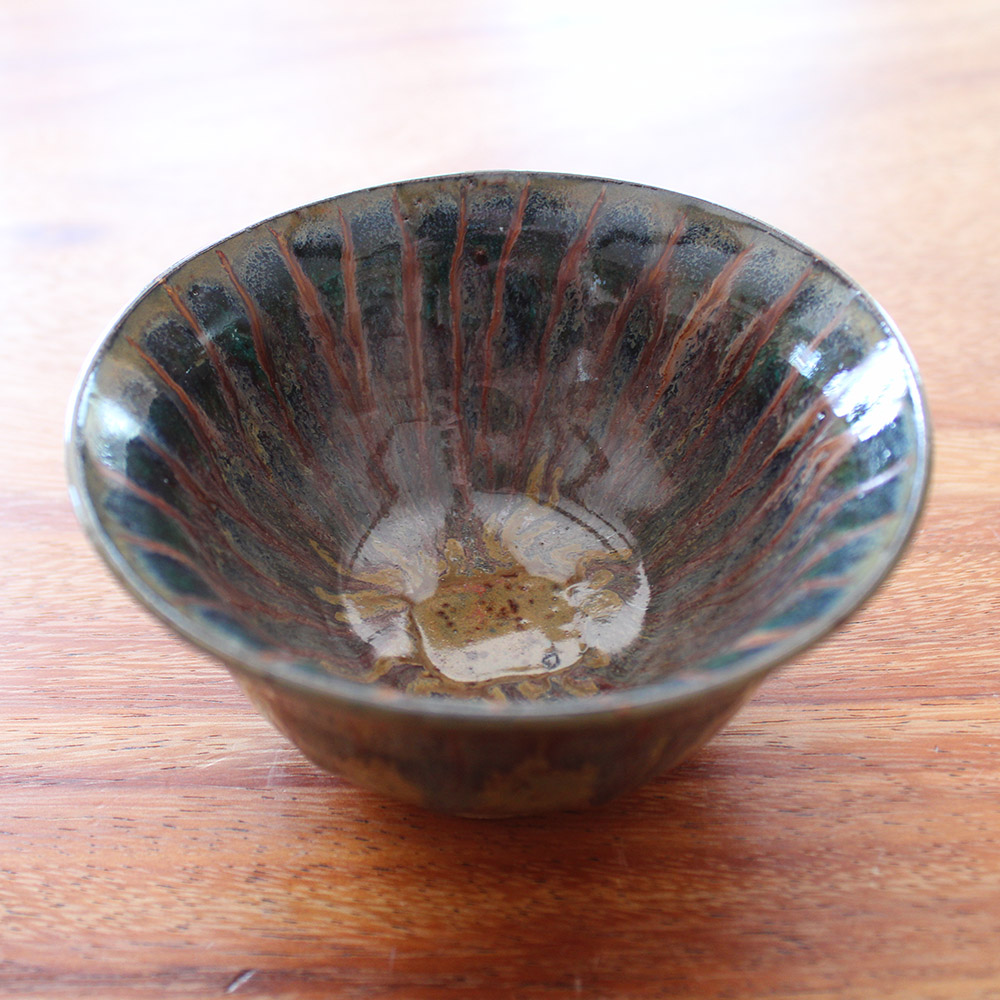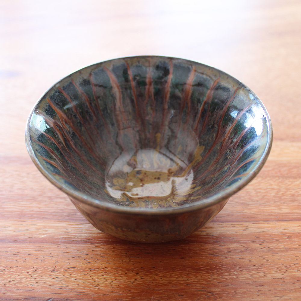 A small snack bowl with a wide, open shape and a dark layered interior where rust, olive, and deep blue draw inward in narrow bands. The shifting color and deeper tones at the rim and center give it the feel of water in shadow. Sized for nuts, olives, berries, or something set out with a drink.