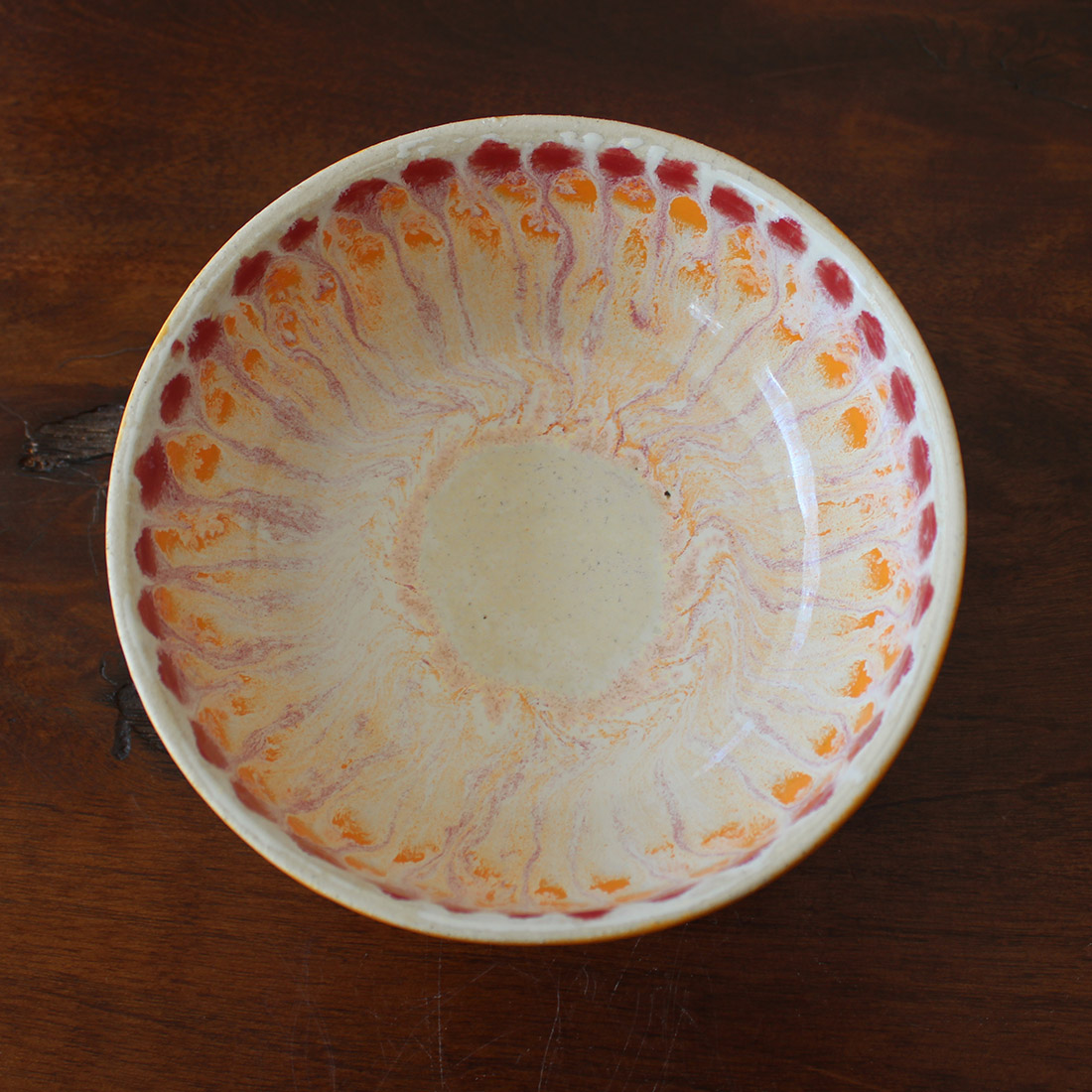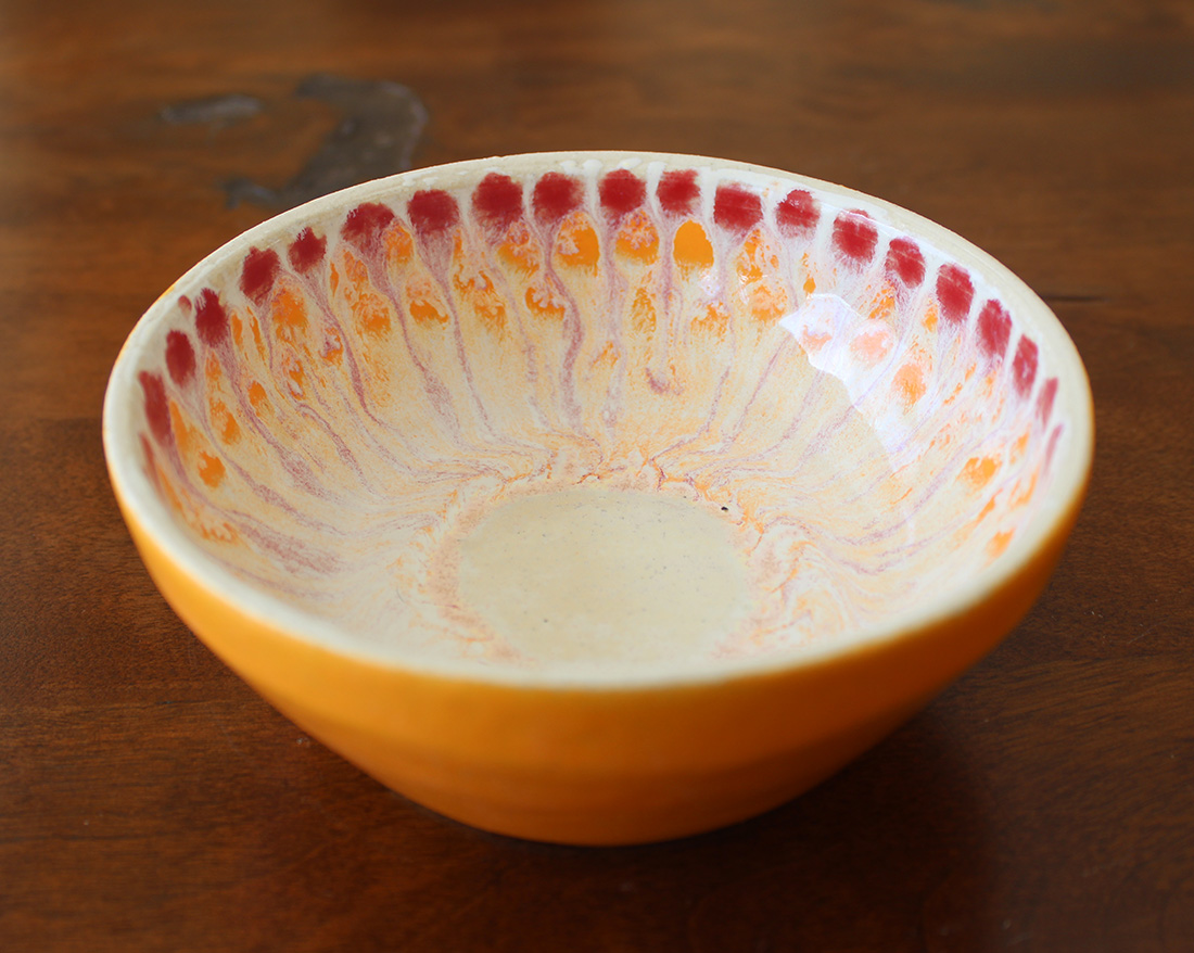 Inspired by the colors of a ripe grapefruit, this hand-thrown bowl radiates layered tones of coral, pink, and sunlit orange from its center. The glazes break and feathers outward in organic movement, creating a citrus-like bloom.