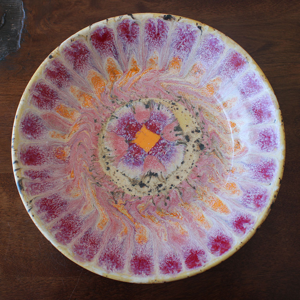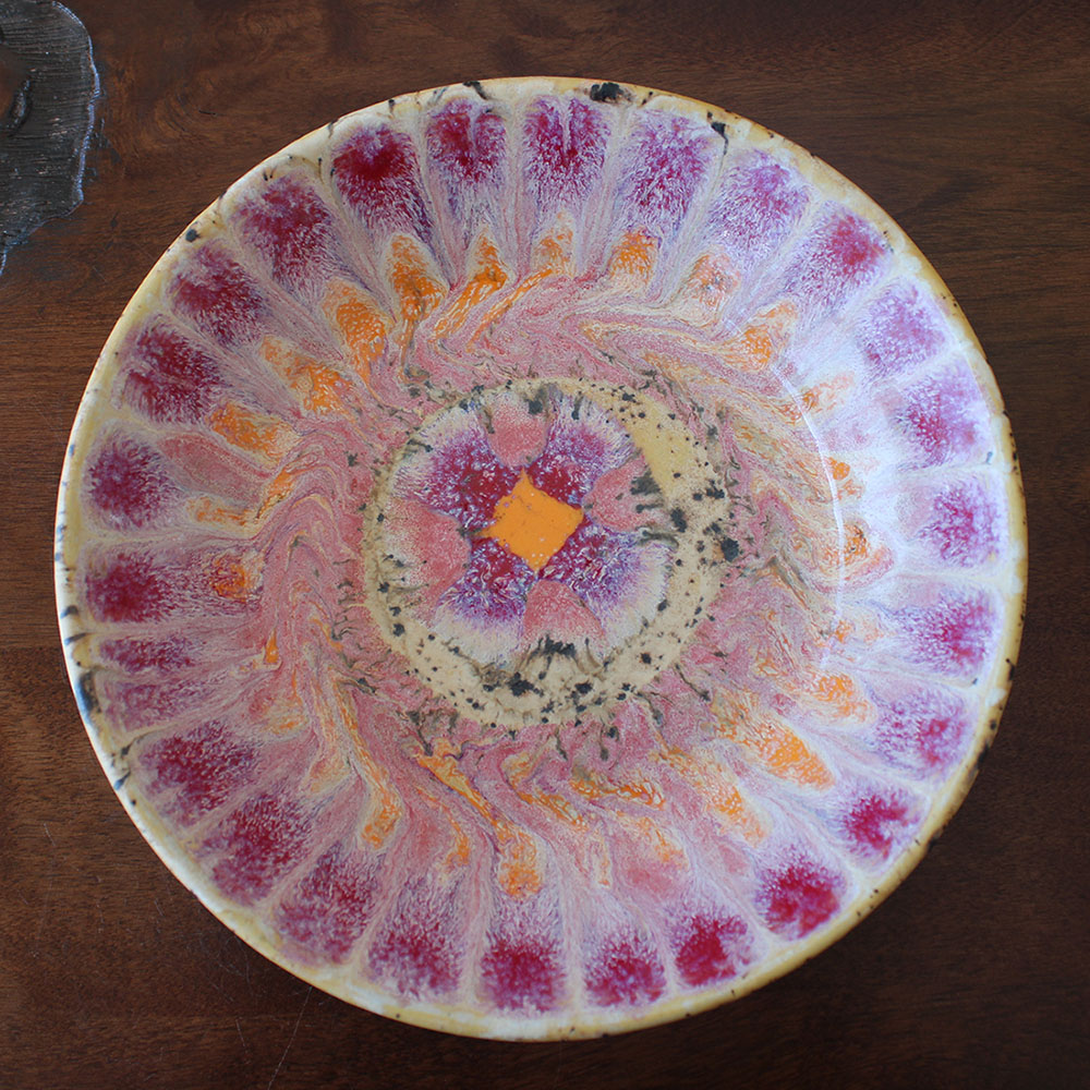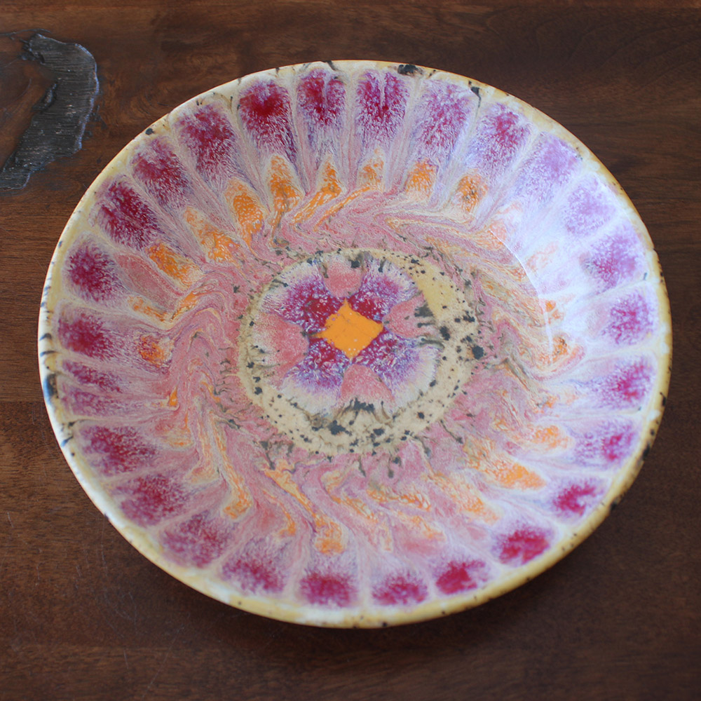 A hand-thrown bowl with layered petals of blush, coral, and soft orange radiating from the center. The glazes swirl and break in organic movement, creating depth and texture that feels both floral and sun-warmed. Sized perfectly for small pasta dishes, fresh salads, or grain bowls, this piece turns a simple meal into something a little more celebratory while still meant for everyday use.