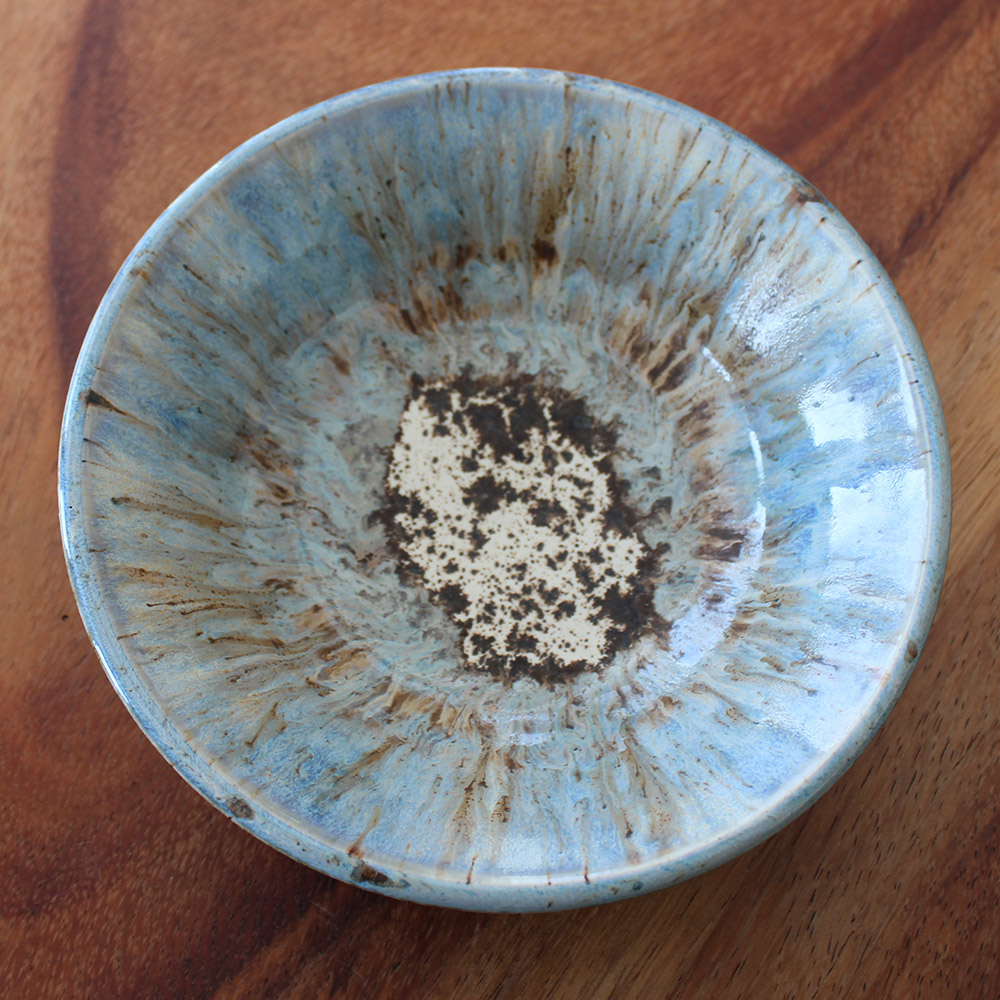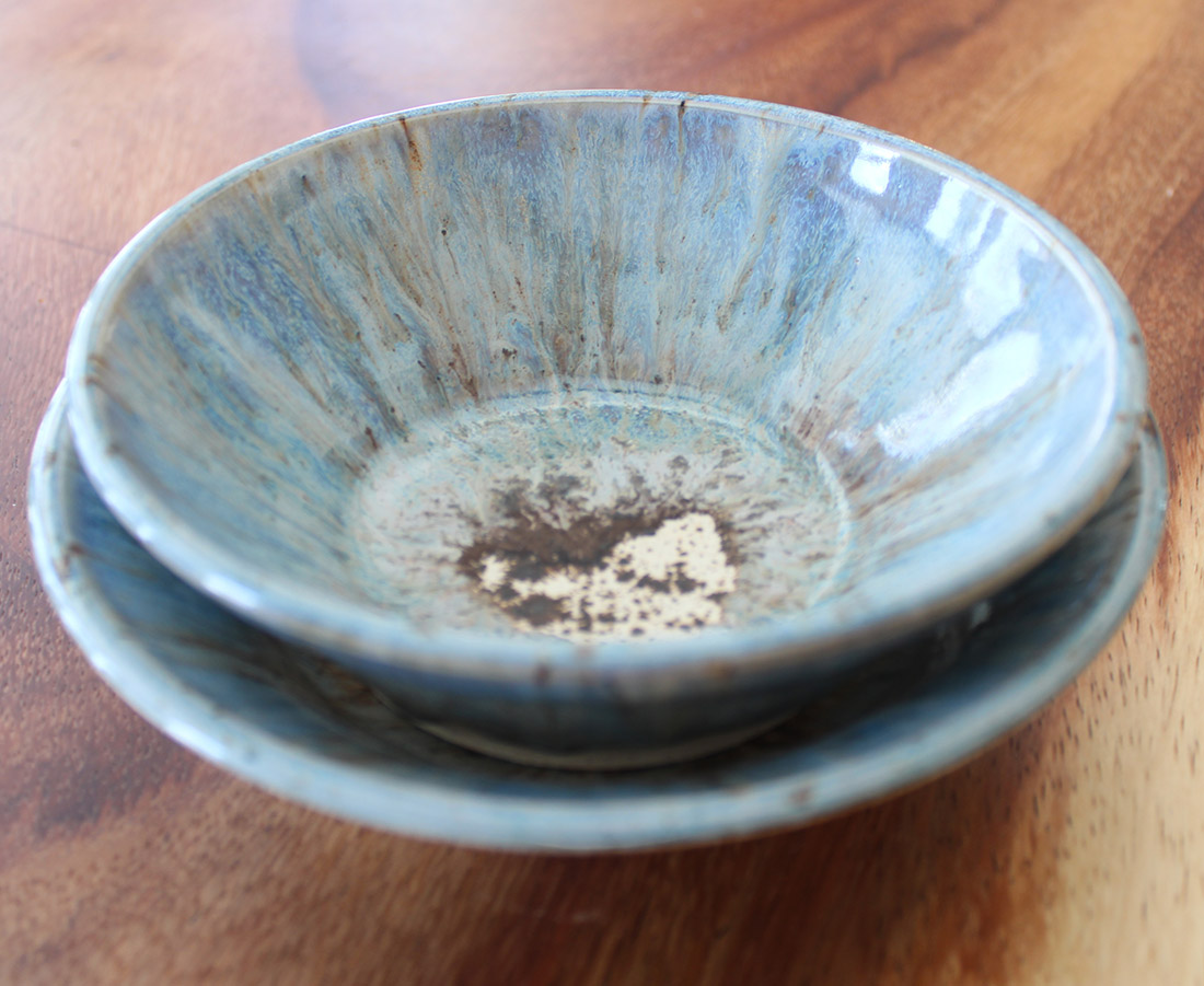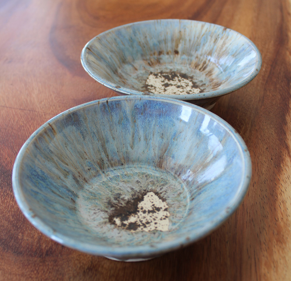 Sold as a pair, these shallow, hand-thrown bowls are designed to nest neatly together when not in use. The glaze breaks in soft blue and cream with darker speckled centers, reminiscent of robin’s egg tones. Well suited for serving sides, snacks, or shared finger foods, these bowls move easily from prep to table.