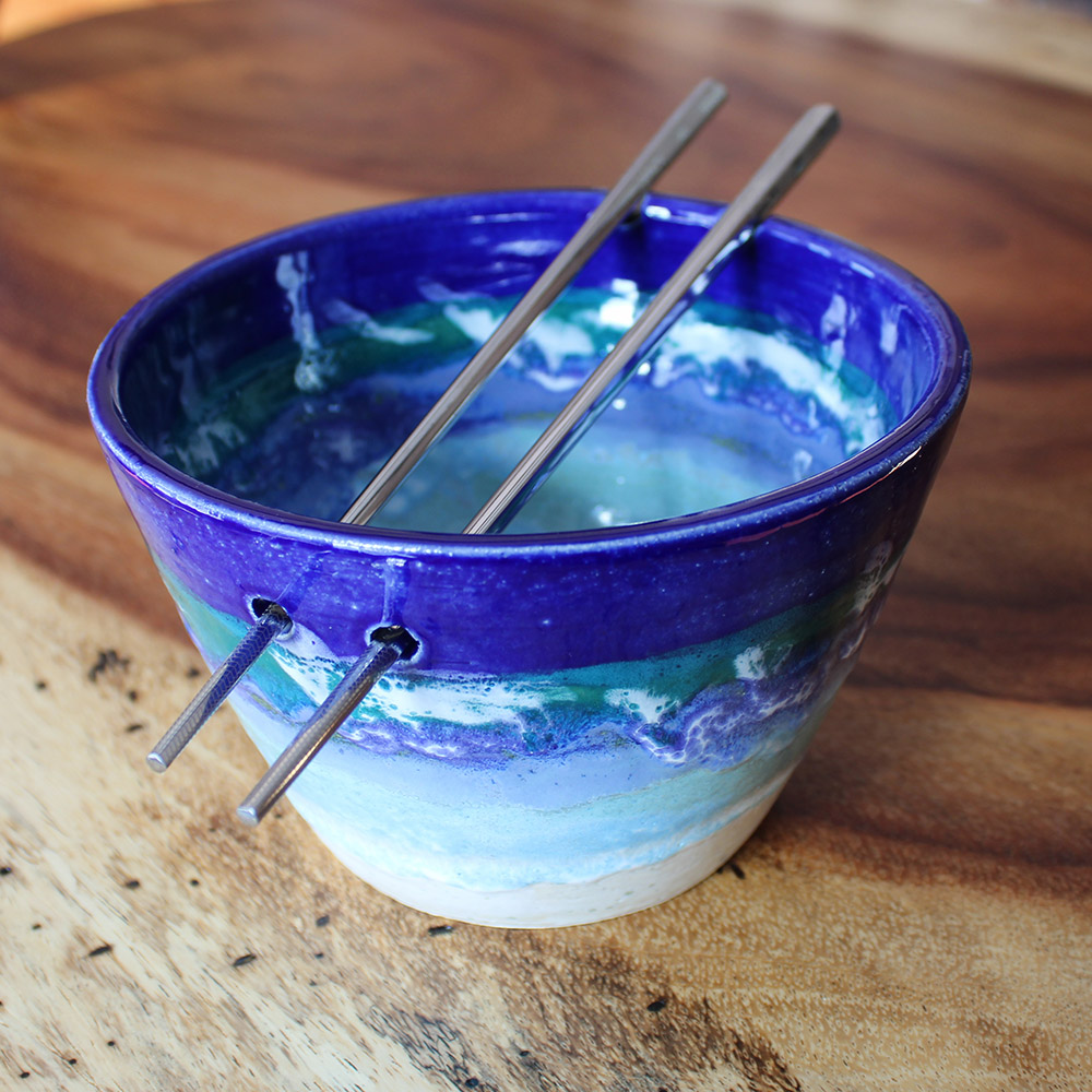 A noodle-sized bowl with layered blues, greens, and soft white tones that move and break like water meeting the shore. Inspired by Hawaii's coastal waters. This bowl is made for warm brothy noodles, unhurried meals, and the quiet comfort of eating together.