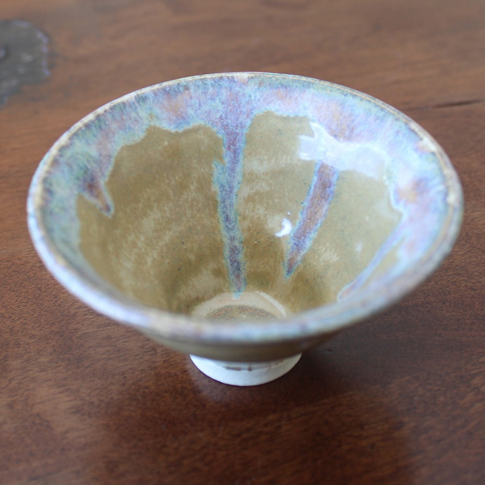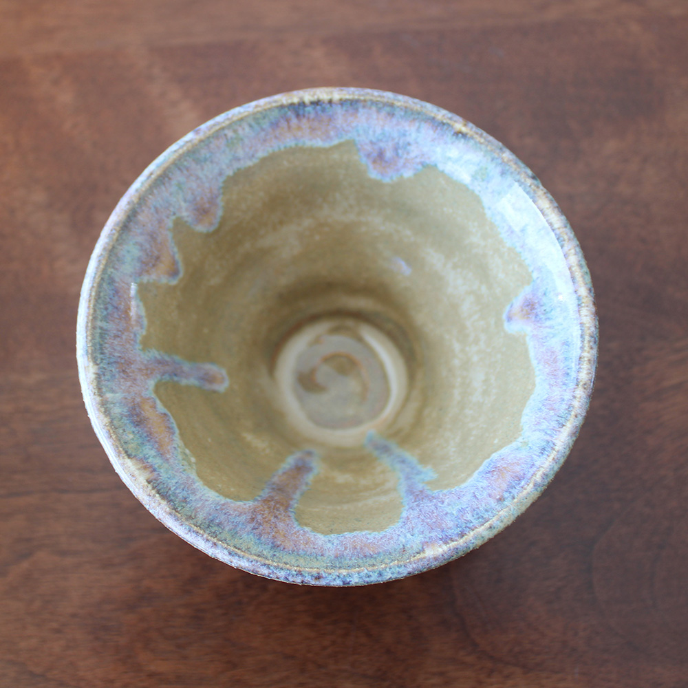 A small, footed bowl with a soft mossy interior and a rim that breaks into muted blue and violet. The glaze pools and pulls naturally, creating subtle movement.