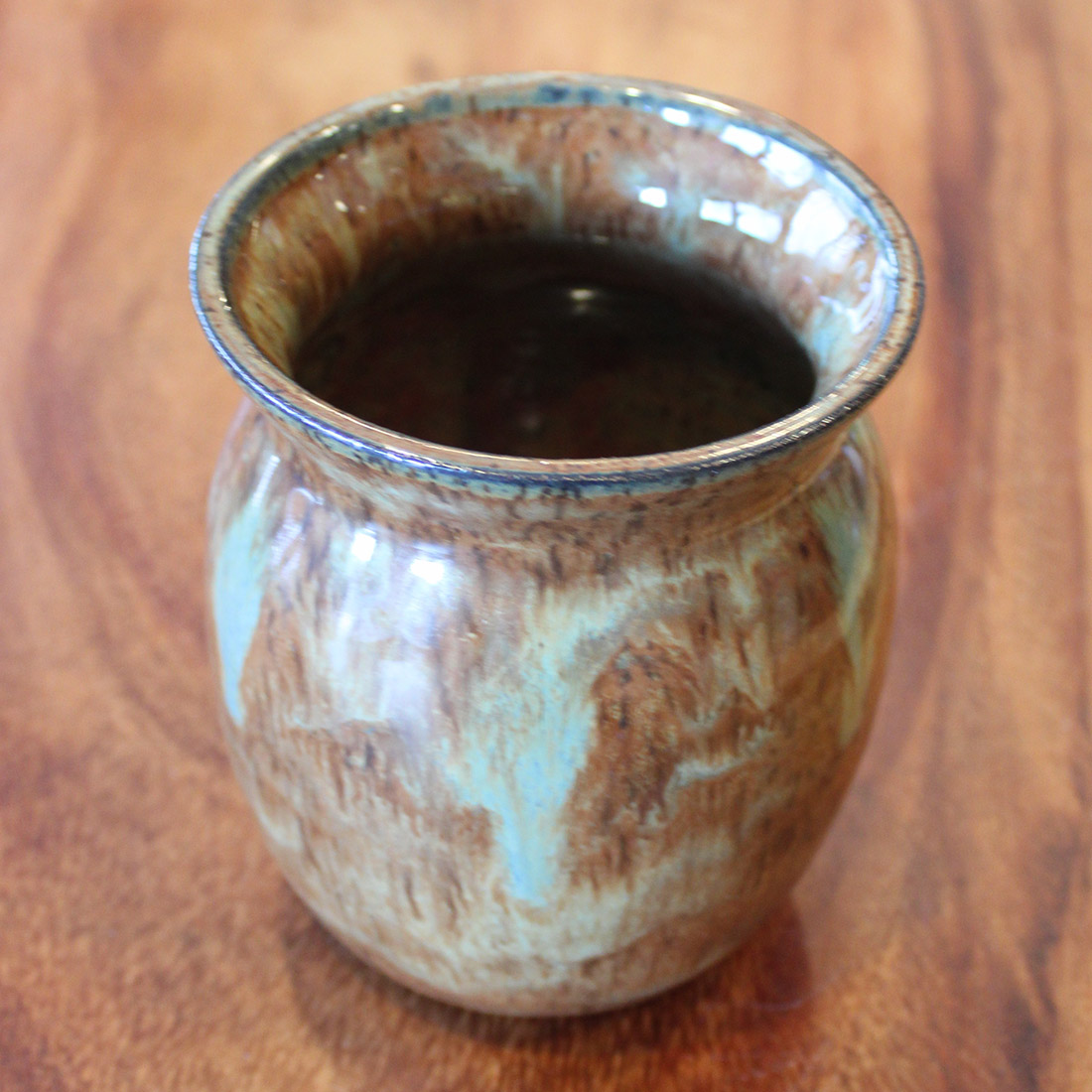 A small vase with a steady, rounded form finished in warm browns and soft blue-green that break and settle like bark after rain. Well suited for fresh flowers or simple dried stems, it stands comfortably on its own or as part of a larger arrangement.