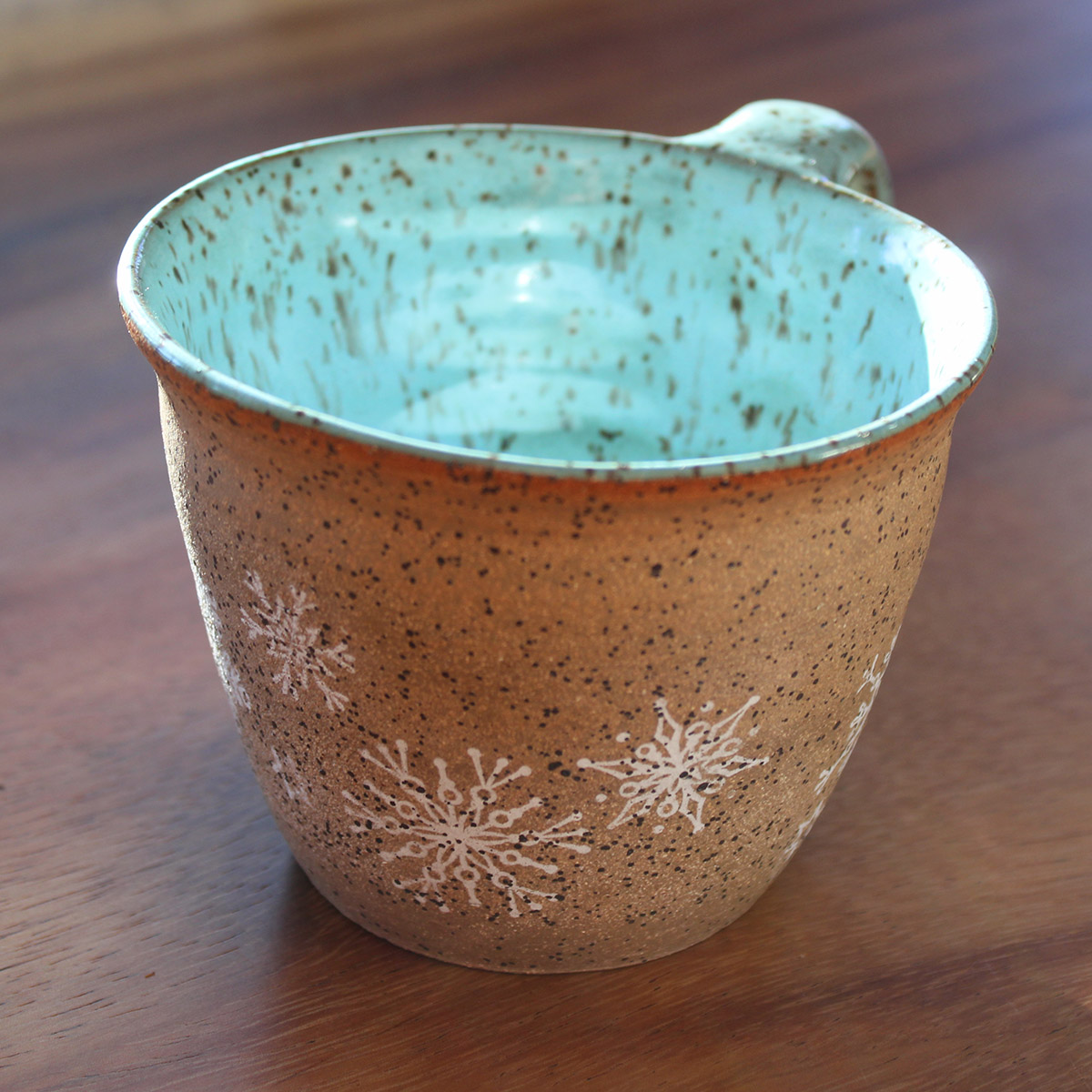 This 10 oz holiday mug is discounted due to a small cosmetic S-crack in the interior glaze.
